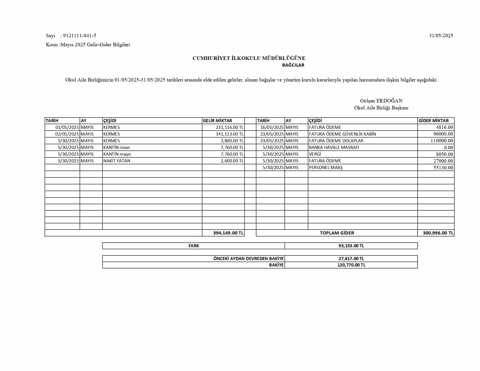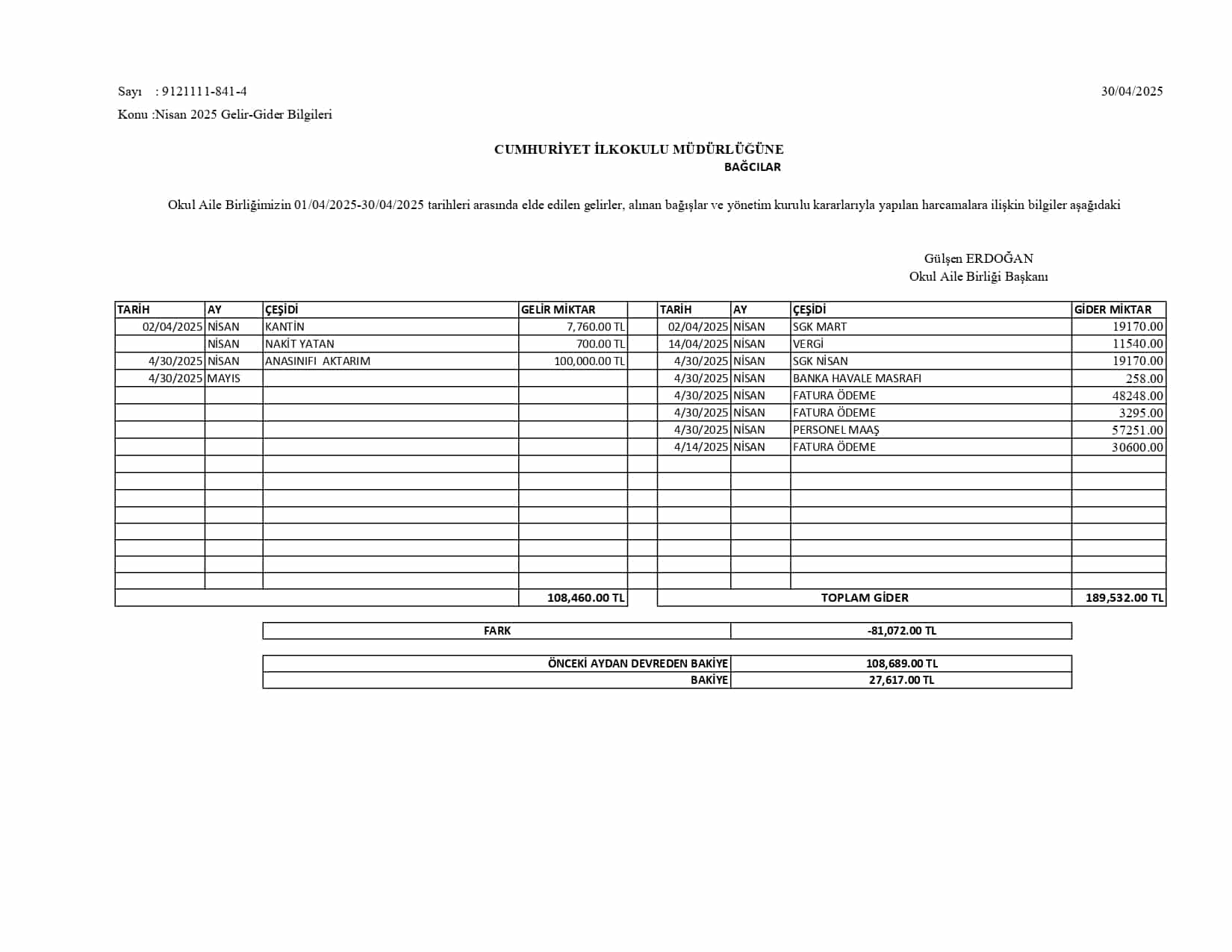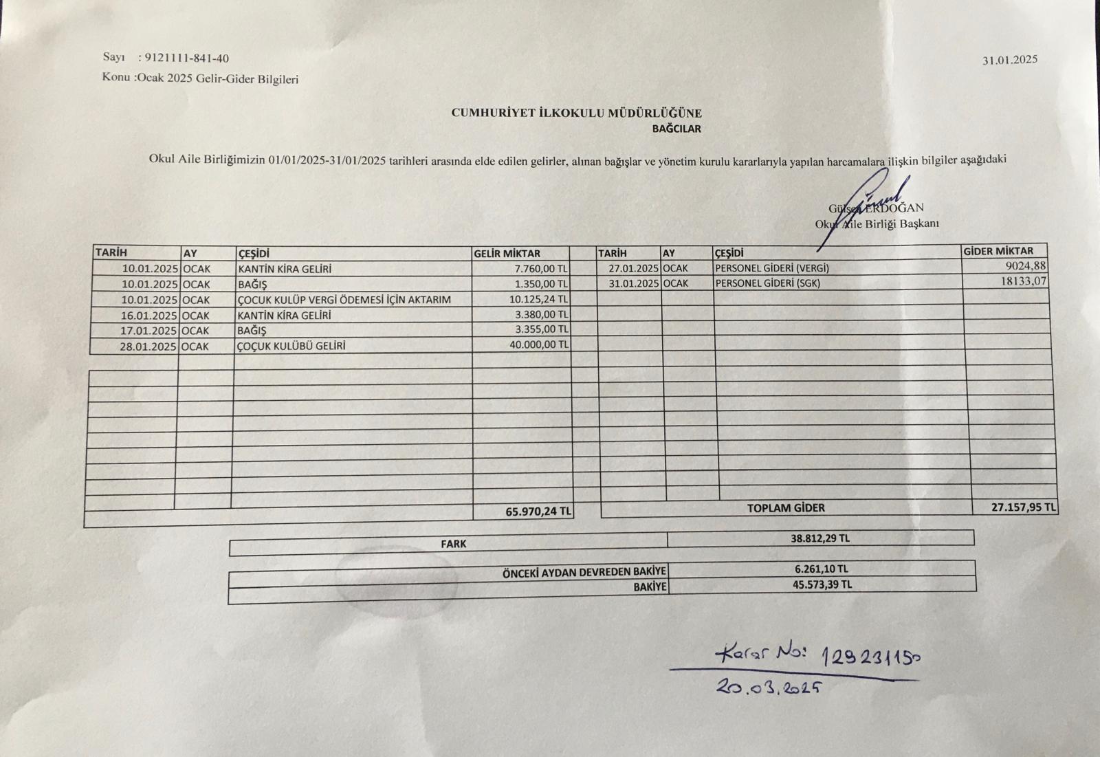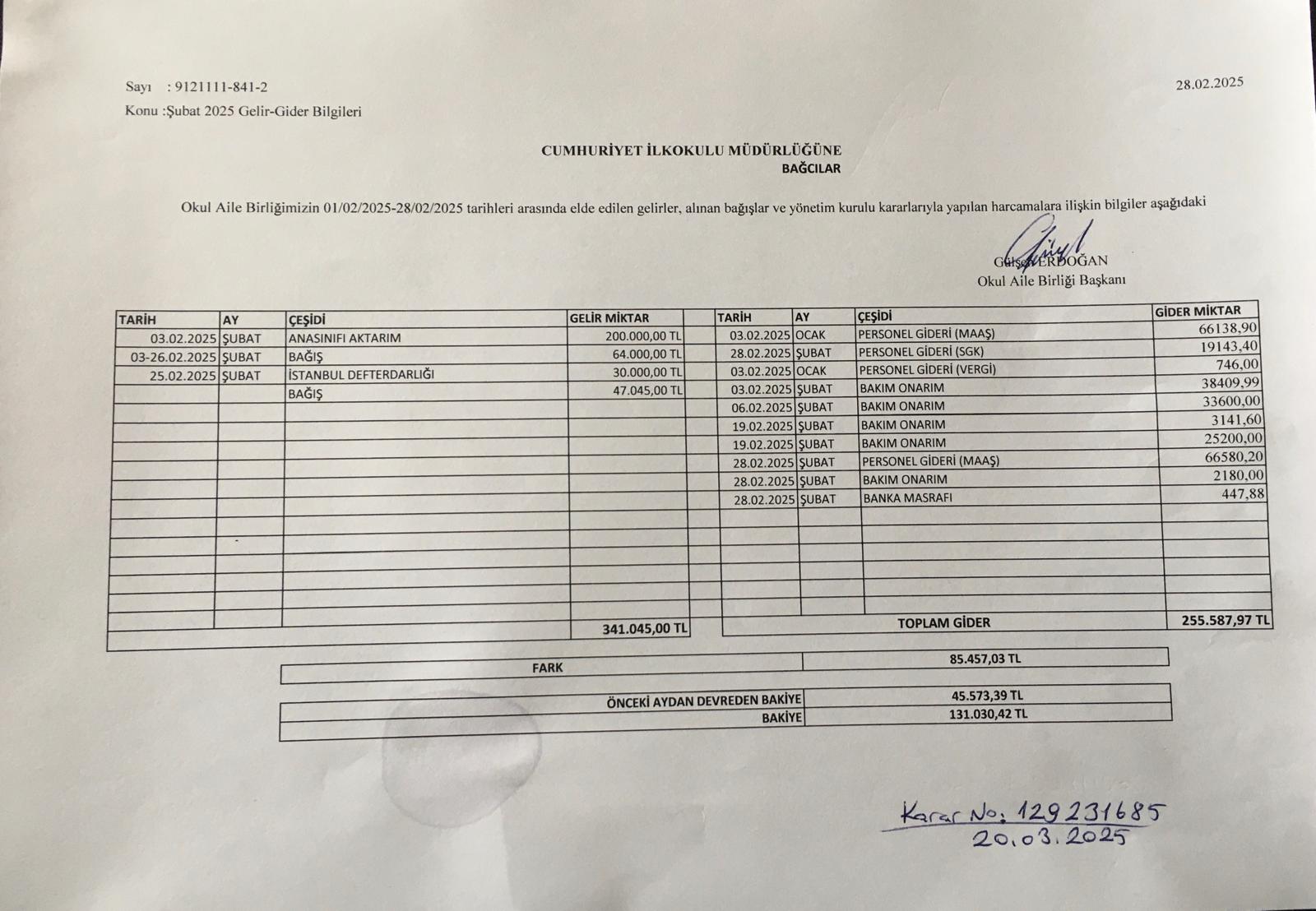 Okul Aile Birliği Gelir Gider Tabloları 2025