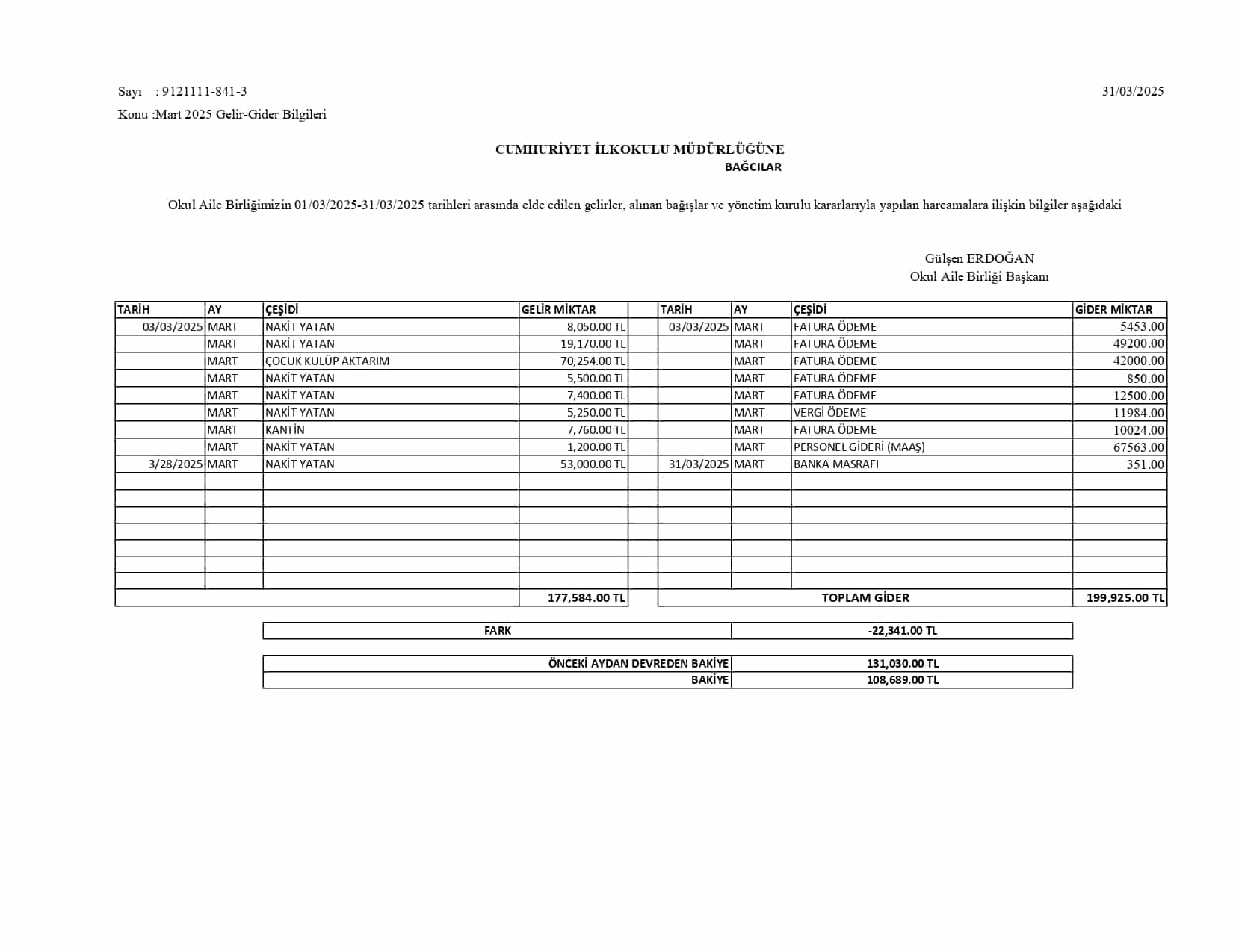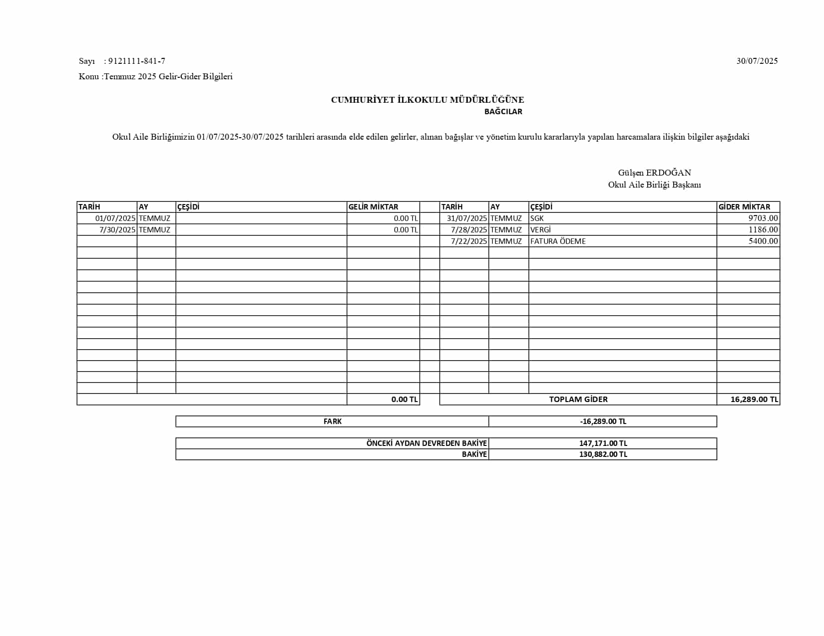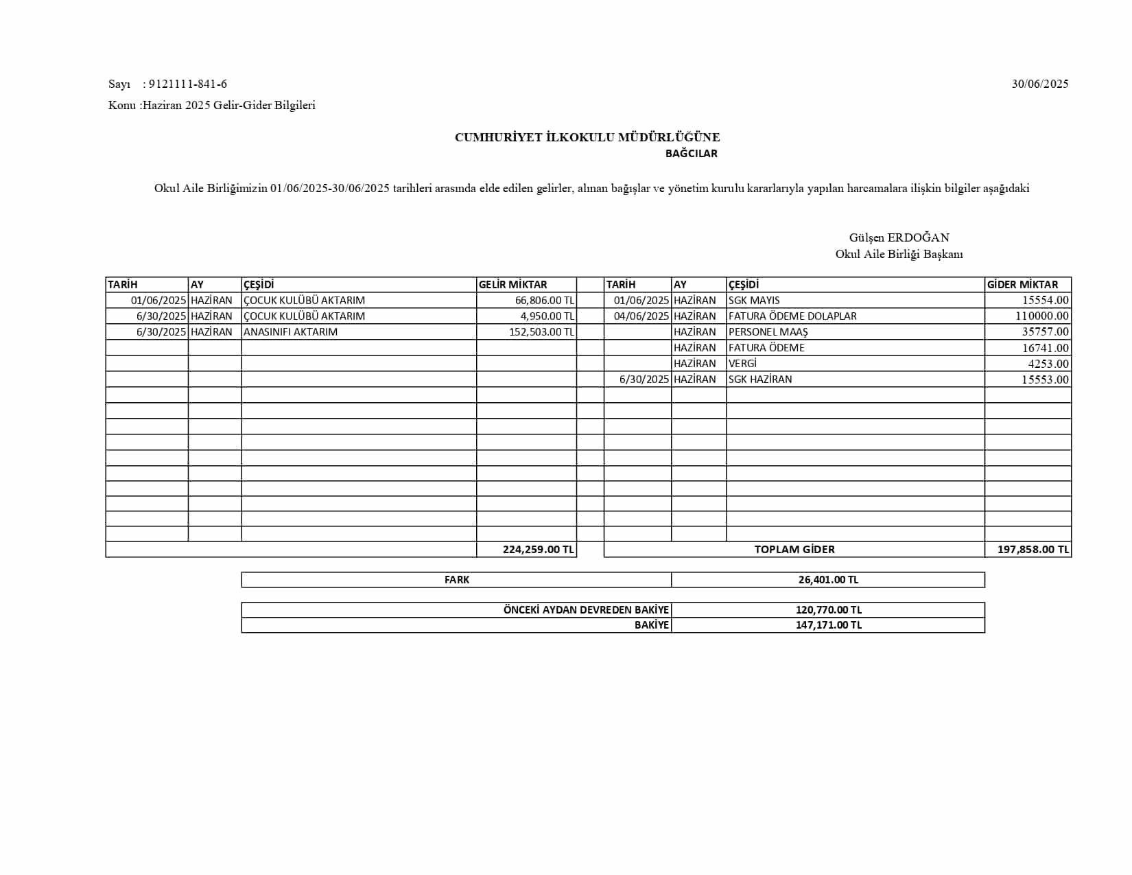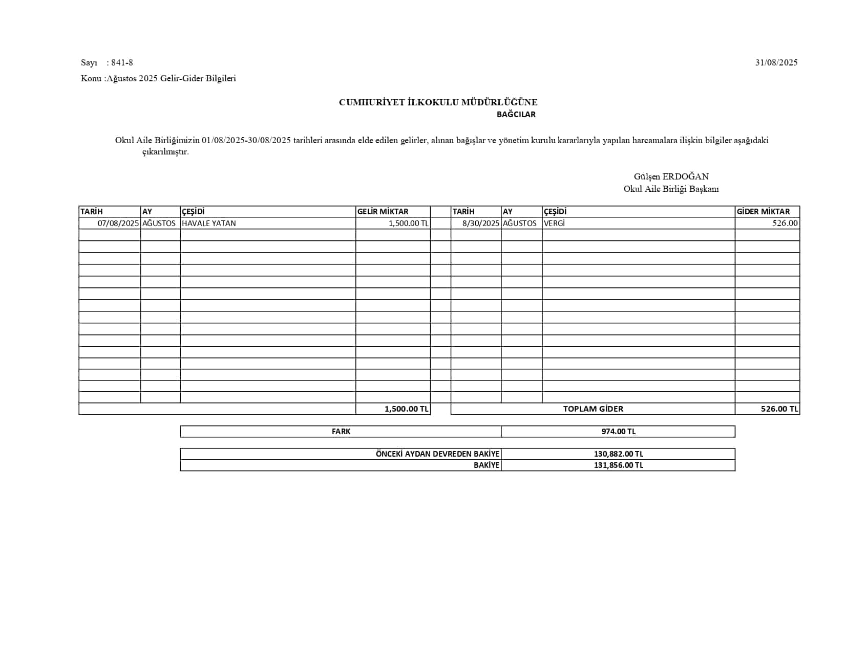 Okul Aile Birliği Gelir Gider Tabloları 2025